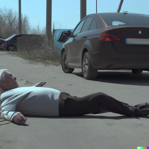 Иллюстрация от #DALLE2, промпт «An old man lying down injured on the road after an accident, a car that hit him speeding away from the scene»