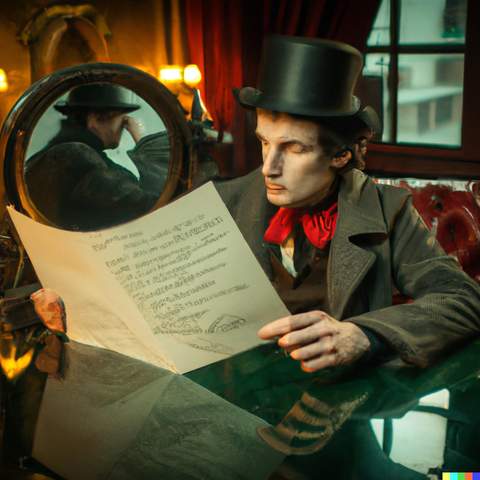 *** картинка от DALL-E 2, «Sherlock Holmes examines a document through looking glass, scene from Tarantino movie»